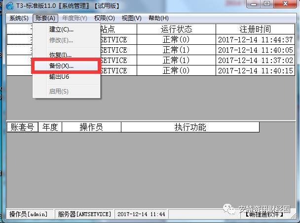 (2)登錄后點賬套下拉菜單 選擇備份 然后選擇準備年結的帳套確認備份