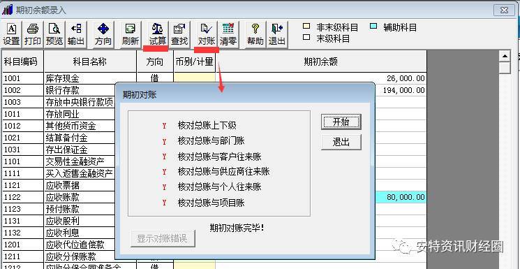 具體步驟:總賬下拉菜單-->設置-->期初余額-->試算&對賬。