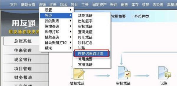 3、退出上面的窗口后,再依次點擊總賬——憑證——恢復(fù)記賬前狀態(tài)。