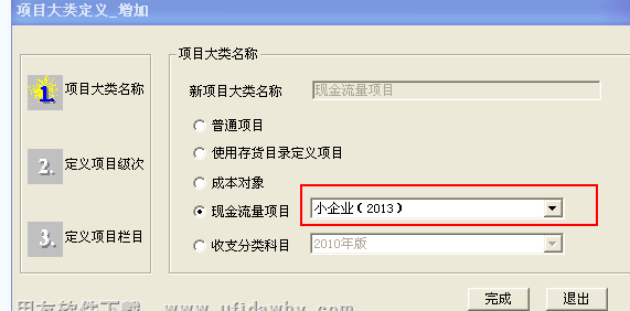 2、再依次點擊基礎設置-財務-項目目錄-增加-現(xiàn)金流量項目,選擇“小企業(yè)2013”,點擊完成后提示“預置完畢”;