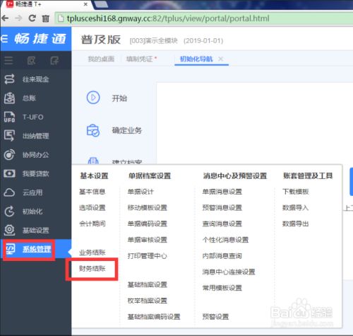 打開軟件,在界面左側(cè)的菜單欄中選擇“系統(tǒng)管理”,點擊“期末處理”中的“財務(wù)結(jié)賬”。