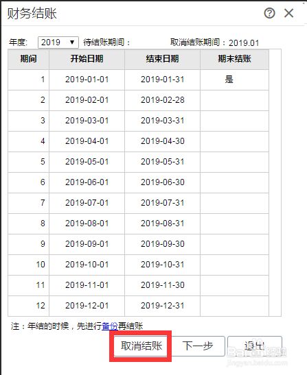 在打開的“財務(wù)結(jié)賬”界面,顯示本年度所有的會計期間,點擊下方的“取消結(jié)賬”按鈕,即可完成反結(jié)賬操作。