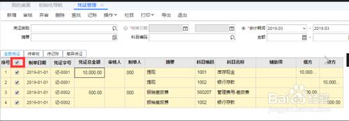 進(jìn)入“憑證管理”查詢結(jié)果的界面,選擇需要反記賬的憑證,勾上“序號”前的方框,選擇所有憑證。