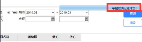 在當(dāng)前界面的右上角出現(xiàn)“單據(jù)取消記賬成功!”的提示信息,表示所選的憑證反記賬成功。