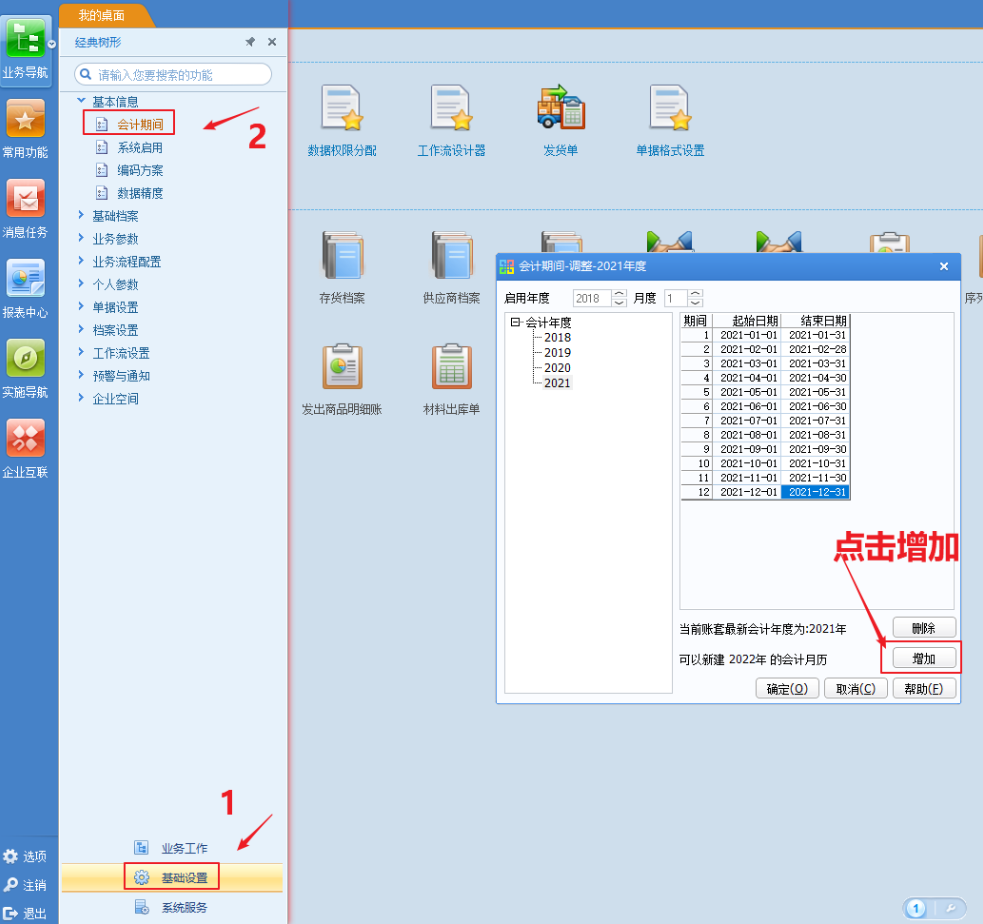 1)手工新建,到基礎(chǔ)設(shè)置-基本信息-會計期間中點增加,手工增加新年度會計期間