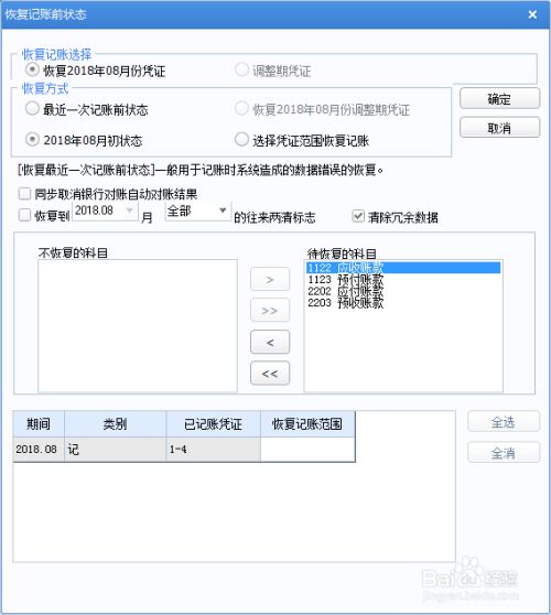 在“恢復(fù)記賬前狀態(tài)”窗口中,“恢復(fù)方式”下選擇“恢復(fù)2018年08月初狀態(tài)”后!點(diǎn)擊“確定”!